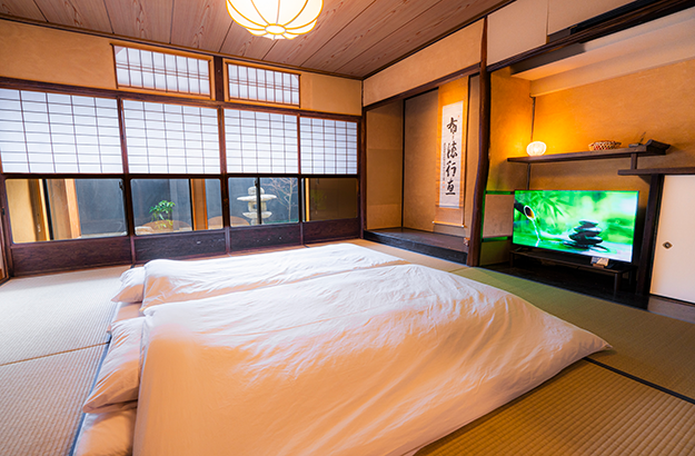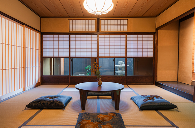 京都駅南側、東寺近くの静かな住宅街にある2階建てを貸切で。最大4名が宿泊でき、畳と洋室にアートが印象的な落ち着いた空間です。冬に登場する日本らしいこたつも大人気。